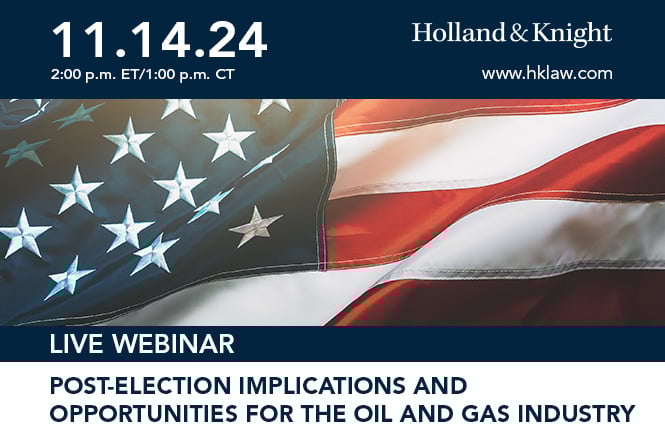 Please join Holland & Knight's Public Policy & Regulation Group and Energy & Natural Resources Industry Sector Group for a post-election presentation on the oil and gas industry and how the newly elected administration and new Congress may affect policies coming out of Washington, D.C.