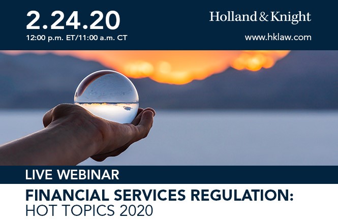 Please join Holland & Knight's Financial Services Regulatory Team for the first in a series of webinars focusing on the 2020 financial regulatory landscape. Our attorneys will provide their perspectives on the hottest topics and perhaps engage in a little crystal ball-gazing for what's ahead in 2020.