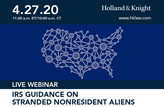 Please join Holland & Knight for a live webinar presentation on the recently published IRS guidance dealing with nonresident aliens stranded in the U.S. as a result of the COVID-19 pandemic.