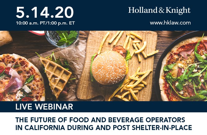 Please join Holland & Knight for a town hall discussion titled "The Future of Food and Beverage Operators in California During and Post Shelter-in-Place." The discussion is intended to bring together a panel of local and state government regulators and private operators in the food and beverage industry to discuss how California's shelter-in-place orders have impacted and affected traditional business operations.