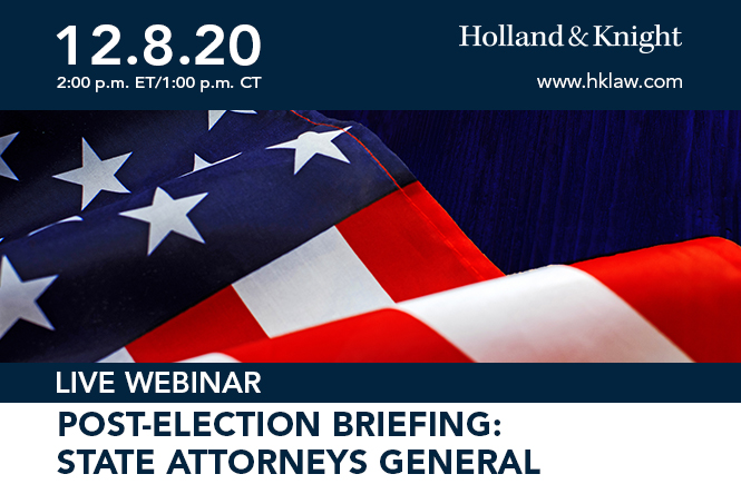 Holland & Knight's experienced lobbyists and attorneys are focusing on the policy implications of the 2020 elections. We look forward to you joining us for our post-election program on state attorneys general, their agendas and how best to position you, your business or your clients for success.