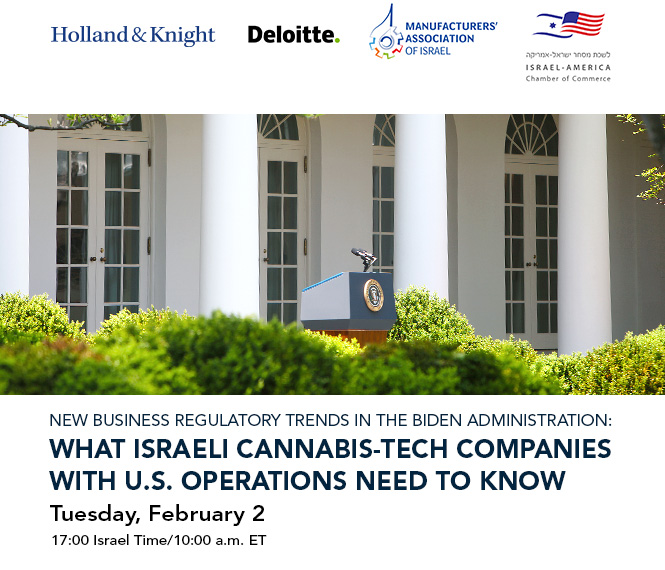 Please join the Israel-America Chamber of Commerce, the Manufacturers' Association of Israel, Deloitte Israel and Holland & Knight for the second of three online panel presentations on new business regulatory trends in the Biden Administration. The second presentation will cover "What Israeli Cannabis-Tech Companies with U.S. Operations Need to Know."