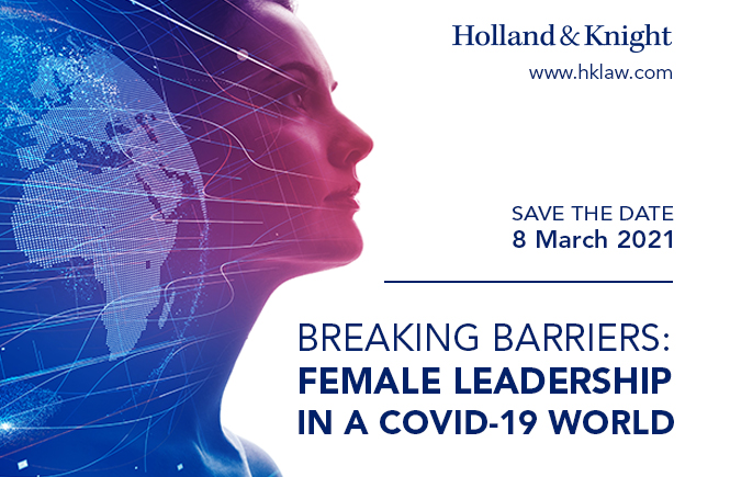 In honor of International Women's Day, you are cordially invited to Holland & Knight's online discussion on business leadership and gender diversity in Latin America, "Breaking Barriers: Female Leadership in a COVID-19 World." Our accomplished speakers will share their thoughts, experiences and overall guidance on the social, business and political issues that impact many women across the Western Hemisphere.