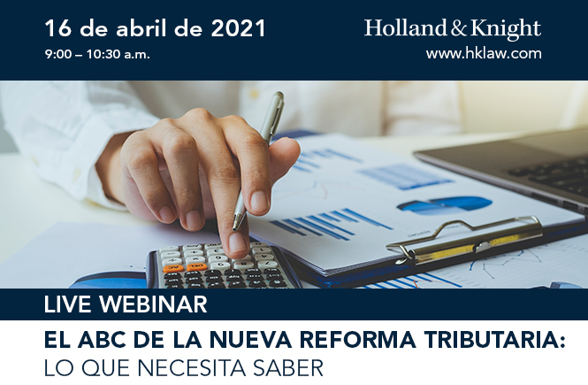 El área tributaria de Holland & Knight lo invita a un conversatorio virtual junto al Viceministro de Hacienda, Dr. Juan Alberto Londoño, quien compartirá sus comentarios sobre el proyecto de Reforma Tributaria, seguido por algunos miembros del equipo de impuestos de la Firma, quienes analizarán las implicaciones que puede tener la denominada Ley de Solidaridad Sostenible en la tributación de su empresa.