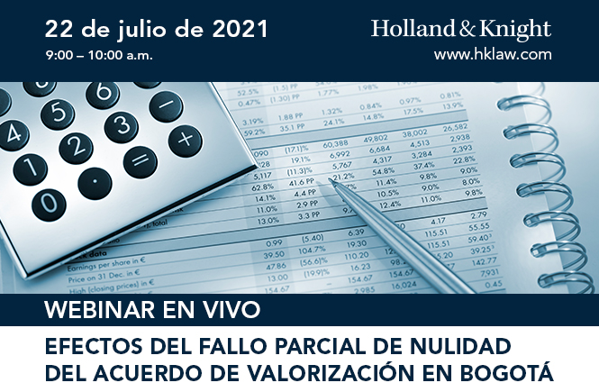 El equipo del área tributaria de Holland & Knight lo invita a participar en el webinar en vivo "Efectos del fallo parcial de nulidad del Acuerdo de Valorización en Bogotá", en el que nos acompañará la exconcejal de Bogotá y demandante de este fallo, Ángela Garzón. Nuestros abogados Juan Carlos Valencia Marquez, Rafael Lafont Castillo, Susana Casas y la Sra. Garzón analizarán las consecuencias de esta decisión y la posibilidad de solicitud de reintegro de las contribuciones. Así mismo, responderán las preguntas de los asistentes sobre el tema.