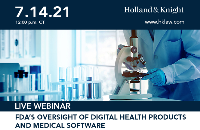 Holland & Knight's Digital Healthcare Group will co-host a webinar with Harvard University and the Harvard Business School Club of Dallas on the U.S. Food and Drug Administration's (FDA) regulation of digital health products and medical software. The FDA regulates many digital health products such as wearables, medical apps and software that use different technologies, including artificial intelligence (AI) and machine learning (ML), to help patients manage their diseases and to help physicians diagnose and treat them. Depending on its use, a product may be subject to minimal or no FDA regulation while others may require FDA clearance prior to marketing.