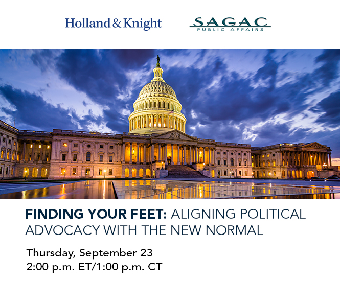 Please join Holland & Knight's Public Policy & Regulation Group and Sagac Public Affairs for a new three-part webinar series, "Finding Your Feet: Aligning Political Advocacy with the New Normal." Our experienced attorneys and professionals will discuss information via three webinars intended for public policy decision-makers, political affairs leads and political action committee (PAC) professionals.