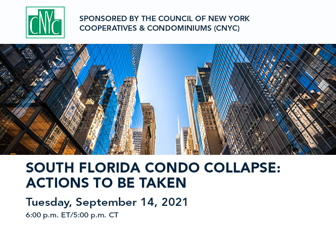 Please join Holland & Knight, in cooperation with the Council of New York Cooperatives & Condominiums (CNYC), for a discussion of actions to be taken following the Surfside, Florida, condo collapse and its implications for New York condominiums and cooperatives.
