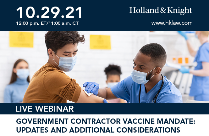 The presentation will build on Holland & Knight's Oct. 12 webinar, "Questions Answered: Government Contractor Vaccine Mandate," and the firm's Sept. 27 alert, "It's a Mandate: Task Force Issues COVID-19 Vaccine Guidance for Government Contractors."