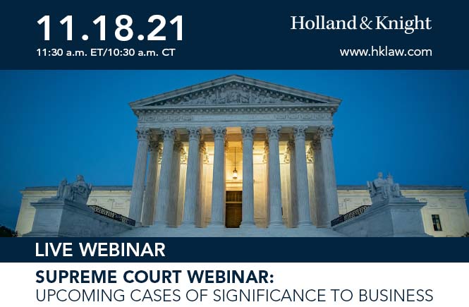 Please join Holland & Knight's Appellate Team for a webinar examining the U.S. Supreme Court and cases of particular significance to the business community. This webinar will provide a timely analysis of current legal issues and a unique perspective on cases that will be decided by the end of the term in June 2022. We will discuss the current term, next year's outlook, recent trends, new developments and what pending cases may tell us about the broader direction of the court.