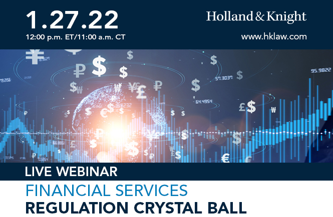 Please join Holland & Knight's Financial Services Regulatory Team for a roundtable discussion on what to expect on the financial services landscape in 2022. Our attorneys will present on a wide range of topics in a "3-Minute Drill" format.