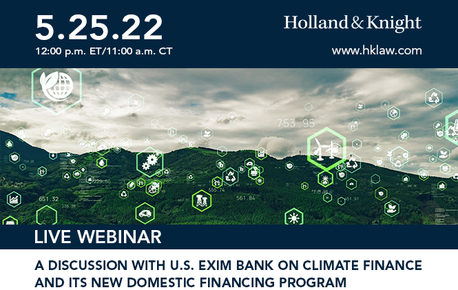 Please join attorneys from Holland & Knight along with special guests from the Export-Import Bank of the United States (EXIM) for a discussion on climate finance opportunities and EXIM's new domestic financing program.