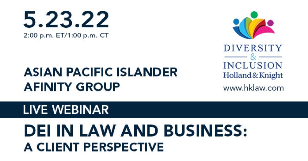 In honor of Asian Pacific American Heritage Month, please join Holland & Knight for an in-depth and practical discussion on how we all can promote diversity, equity and inclusion (DEI) in our organizations, whether in law firms or legal departments.