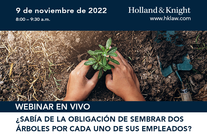 Conéctese a la charla virtual de Holland & Knight y C-Neutral para conocer lo dispuesto por la ley, el estado actual de su reglamentación, cuándo serán exigibles las obligaciones derivadas de la misma y cómo ejecutar dicha siembra desde el punto de vista práctico. La charla contará con los abogados José Zapata y Margarita Solorza, así como Boris Mulett, el fundador y CEO de C-Neutral.