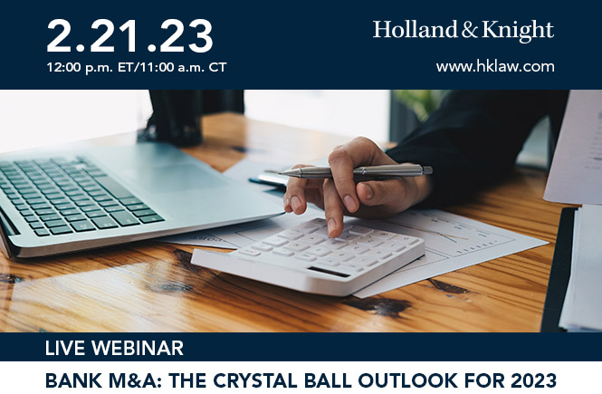 Holland & Knight's Financial Services Regulatory Team and Community Banking Group will host a roundtable discussion on the outlook for bank mergers and acquisitions (M&A) in 2023, as well as the key issues that will affect bank M&A during the year.