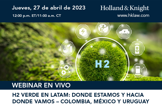 Holland & Knight se complace en invitarlo a participar de un webinar en el que conocerá la situación actual del hidrógeno verde en Latinoamérica y las metas a corto y largo plazo que tendrán que cumplirse para lograr una transición exitosa. Algunos de los temas a tratar por los panelistas serán: