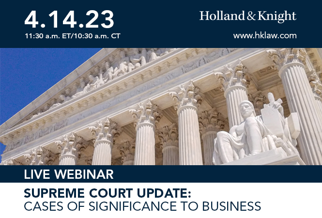 The U.S. Supreme Court is hearing arguments and issuing decisions with major ramifications for business interests of all sorts. Please join Holland & Knight for a webinar that will analyze decided and upcoming cases, as well as examine their impacts to daily business operations.
