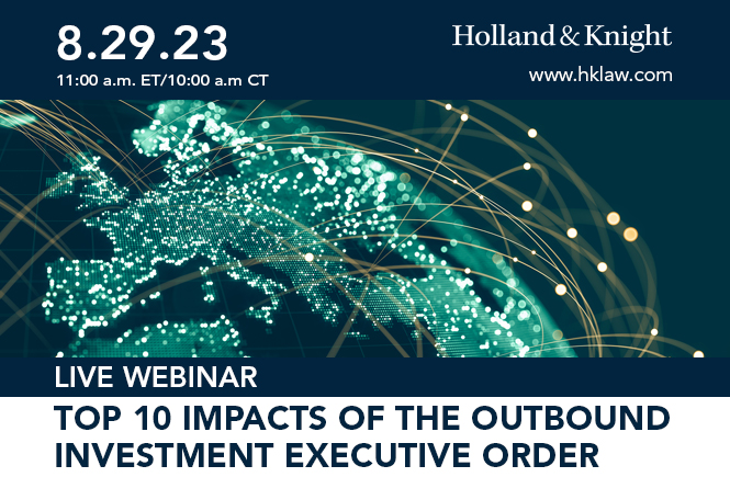 Please join attorneys Robert Friedman, Antonia Tzinova and Andrew McAllister of Holland & Knight's International Trade Group for a webinar to discuss the top 10 impacts of the recent Executive Order (E.O.) addressing U.S. outbound investments in certain national security technologies and products in China.