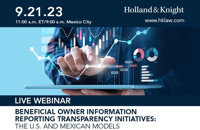 Please join Holland & Knight attorneys from the United States and Mexico for a webinar that will familiarize you with the components of the transparency laws of both countries and provide insights as to how entities, their owners and advisors in both countries should deal with these initiatives. There will be ample opportunity for Q&A.