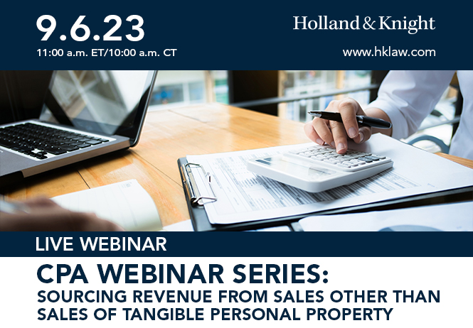 Please join Holland & Knight's State and Local Tax Team in a discussion of sourcing rules for sales other than sales of tangible personal property.