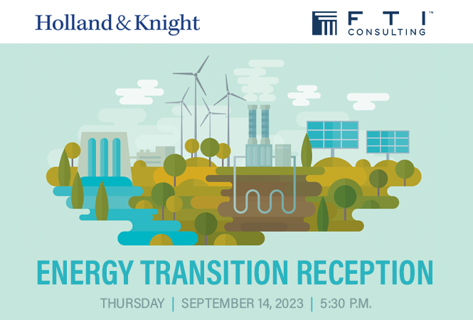 Please join Holland & Knight and FTI Consulting for an Energy Transition Reception at the Petroleum Club of Houston. The event will include a panel discussion by senior industry leaders, as well as a networking happy hour with drinks and hors d'oeuvres. Our panelists will cover crucial topics relevant to the energy transition.