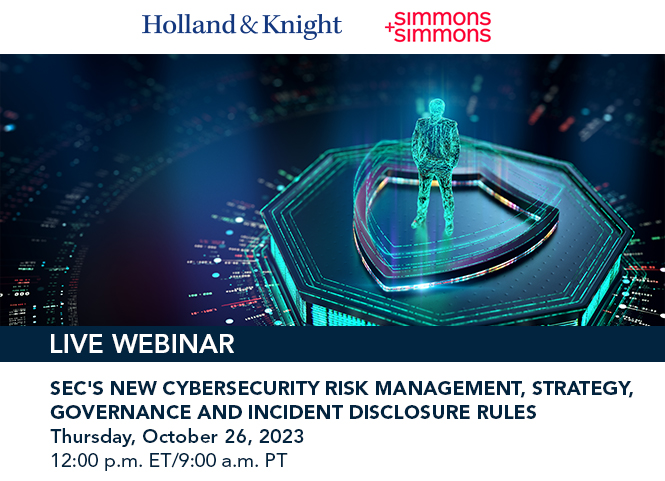 Please join Holland & Knight and Simmons & Simmons for a compelling interactive program that will enhance clients' understanding of the U.S. Securities and Exchange Commission's (SEC) new Cybersecurity Risk Management, Strategy, Governance and Incident Disclosure rules, and the impact on public companies, including foreign private issuers.