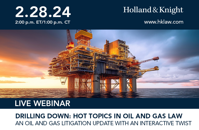 Please join attorneys Greg Meece and Megan Schmid from Holland & Knight's Oil and Gas Practice for an engaging discussion focusing on recent oil and gas litigation, with practical tips for risk mitigation from a litigation viewpoint.