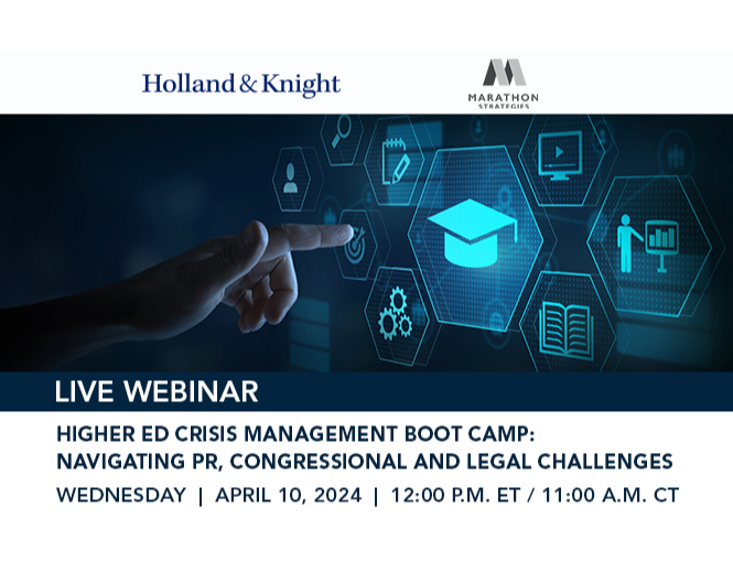 With higher education facing unprecedented scrutiny, we invite you to join our Higher Ed Crisis Management Boot Camp, where industry leaders from Holland & Knight and Marathon Strategies will detail what colleges and universities need to do to navigate the unprecedented media and government oversight challenges they are now facing from both sides of the political spectrum, as well as how to integrate communications and government affairs for successful crisis management.