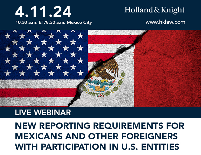Holland & Knight's Corporate Transparency Act Team will address the above key developments, as well as a number of other important issues under the CTA, particular to the Mexican market. Attorneys Eugenio Grageda, Alan Granwell and Michael Titens will cover topics including: