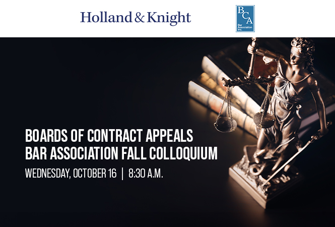 Please join Holland & Knight at our Washington, D.C., office for the Boards of Contract Appeals Bar Association (BCABA) Fall Colloquium, which will include two informative panel discussions. The first panel will explore the state of professionalism in practice before the Boards of Contract Appeals (BCAs), and the second panel will discuss quantum theories and best practices for providing damages in board litigation. In addition to discussing these issues, our panels will also offer thoughts on how these matters might best be addressed by the BCAs.