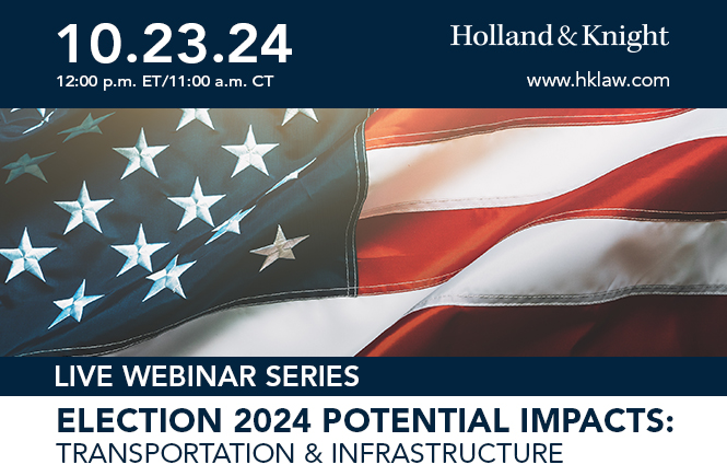 Please join Holland & Knight's Public Policy & Regulation Group and Transportation & Infrastructure Industry Sector Group for a pre-election preview of the implications the November elections will have on federal transportation and infrastructure priorities and spending by the next administration and 119th Congress.