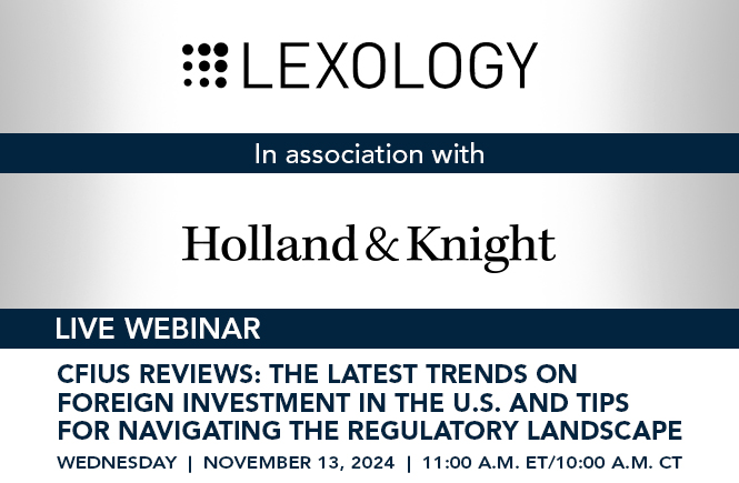 International Trade attorneys Robert Friedman, Andrew McAllister and Antonia Tzinova will participate in a Lexology webinar analyzing developments affecting cross-border mergers and acquisitions (M&A) and foreign investment in the U.S. They will look at enforcement and compliance activity from the Committee on Foreign Investment in the United States (CFIUS), including a proposed rule enhancing the committee's penalty authority, along with a breakdown of the largest-ever fine for non-compliance. Other topics of discussion will include renewed regulatory scrutiny of real estate transactions close to national security locations, proposed rules on outbound investment screening and how the U.S. presidential election could affect CFIUS priorities.