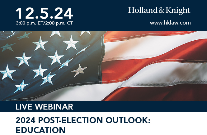Holland & Knight's Public Policy & Regulation Group will discuss the impacts of the 2024 elections on the industry priorities that matter to education stakeholders. Speakers will discuss a number of policy priorities, including end-of-year expectations, the U.S. Department of Education, higher education, K-12 issues and other potential implications to look out for under the newly elected Trump Administration and Republican majorities in the U.S. Senate and House of Representatives.