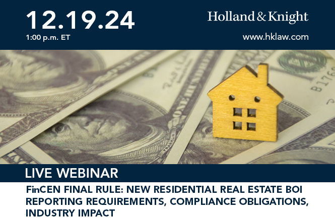 Please join us for a continuing legal education (CLE) webinar that will guide practitioners through the U.S. Department of the Treasury's Financial Crimes Enforcement Network's (FinCEN) long-awaited final rule to increase transparency in non-financed residential real estate transactions that will significantly impact covered real estate entities with extensive new reporting obligations. The panel will address who is covered by the new rule, the reporting requirements and best practices to prepare for compliance.