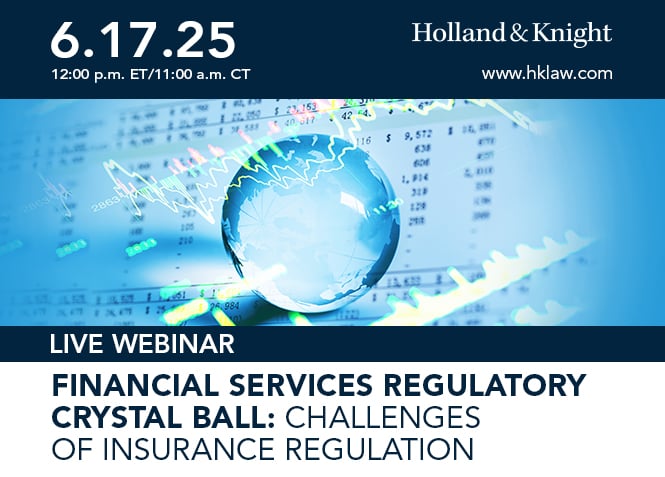 Please join Holland & Knight for the next installment of our Crystal Ball Webinar series, as we provide an overview of trends and recent developments impacting the insurance space. Moderated by Partner Thomas Bentz, who co-chairs the firm's Insurance Industry Team, the discussion will feature Partners Greg Hoffnagle, Ronnie Johnson and Alex Selarnick, along with Senior Policy Advisor Beth Vecchioli.