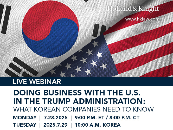 Please join attorneys Jeremy Burkhart, David Cole, Harold Lee and Sara Peters from Holland & Knight's Government Contracts, Data Strategy, Security & Privacy, Intellectual Property, Public Policy & Regulation and Corporate Services practices for a webinar designed to provide Korean businesses with insight on how to compete for U.S. government contracts, how to safeguard valuable intellectual property (IP) and how to engage with the U.S. government in the Trump Administration.