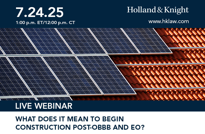 Please join attorneys Amish Shah, Elizabeth Crouse and Bryan Marcelino from Holland & Knight's Renewable and Alternative Energy Tax Team for a review of the current rules taxpayers must meet to have satisfied the test and discuss its application under the changes made to law as a result of OBBB.