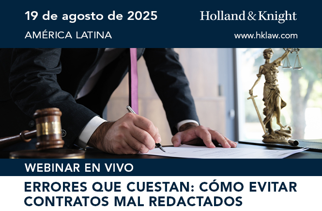 Holland & Knight tiene el gusto de invitarle a este seminario en el que nuestros abogados comerciales Selene Espinosa y Daniel Fajardo analizarán ejemplos reales de errores comunes en la redacción contractual, sus consecuencias legales y financieras, y cómo prevenirlos de manera práctica.