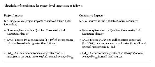 The following discussion highlights the new thresholds for GHG and local community risks and hazards impact (TACs and PM2.5) emissions.
