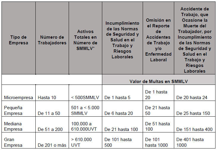 El Ministerio del Trabajo mediante el decreto 472 de 2015 reglamentó los criterios de graduación de las multas a las compañías, conforme a la obligación impuesta por el artículo 13 de la ley 1562 de 2012, cuando estas infrinjan las normas de Seguridad y Salud en el Trabajo y Riesgos Laborales; e introdujo la obligación de reportar los accidentes de trabajo graves o mortales y enfermedades laborales por los empleadores, a las direcciones territoriales correspondientes del Ministerio del Trabajo.
