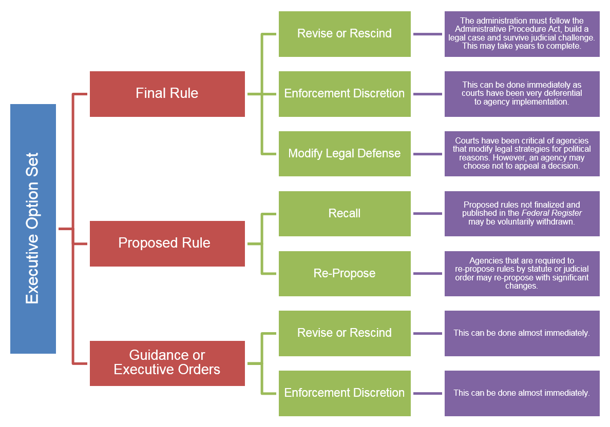 - The Trump Administration may utilize a variety of executive and legislative options to modify or eliminate the plethora of energy regulations that the Obama Administration is working to complete before leaving office.