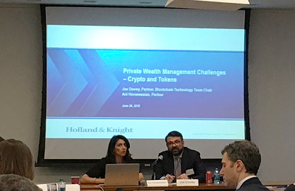On June 26, 2018, Partners Ani Hovanessian and Joe Dewey presented on the various private wealth challenges connected to virtual currency. Ms. Hovanessian, an attorney in the Private Wealth Services Group, focused on the tax and estate planning issues involved, while Blockchain Technology Team Chair Mr. Dewey shared his technological knowledge on the subject matter. The audience of around 75 people was filled with professionals in various industries, such as financial advisors, public accountants, in-house legal counsel, and other Holland & Knight peers.