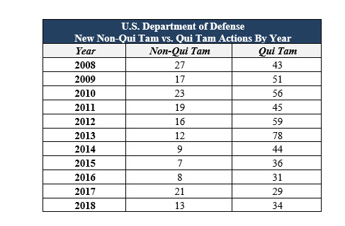 The DOJ's report also breaks out recoveries by industry. For the DoD, the number of non-qui tam actions decreased from 21 in fiscal year 2017 to only 13 in fiscal year 2018 while the number of qui tam actions in fiscal year 2018 increased by 5. Below is a chart summarizing all new DoD-related non-qui tam versus qui tam actions brought over the last ten years.2
