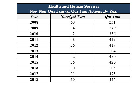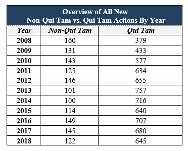 These numbers show that there were 23 less non-qui tam actions filed, and 35 less qui tam actions filed, in fiscal year 2018 than in fiscal year 2017. The trend over time is still in an upward trajectory for qui tam cases and static for DOJ initiated cases.