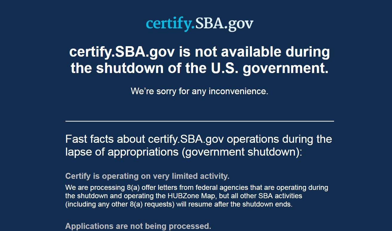 Certain actions do continue under Certify.SBA.gov. These are 8(a) offer letters from federal agencies that are operating during the shutdown, along with the continued operation of the HUBZone Map. The SBA is also continuing to operate the Office of Disaster Assistance (ODA), which plays a vital role in the aftermath of disasters and is not funded by yearly appropriations. All other SBA activities on Certify.SBA.gov (including any other 8(a) requests) are halted and will resume after the shutdown ends.