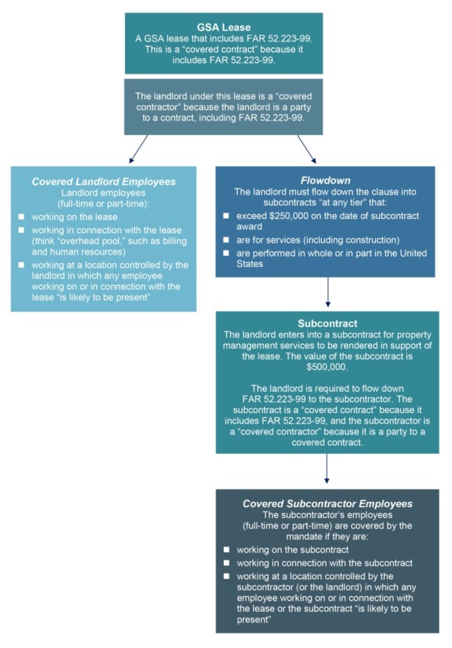 For many GSA landlords, the leased properties are often held by single purpose entities (i.e., limited liability companies (LLCs) or S corporations formed for the "single purpose" of holding the specific parcel of real estate) with no employees, so there may be no direct impact to lessor entities. However, the new FAR clause requires contractors to "flow down" the clause to subcontracts "at any tier" that: