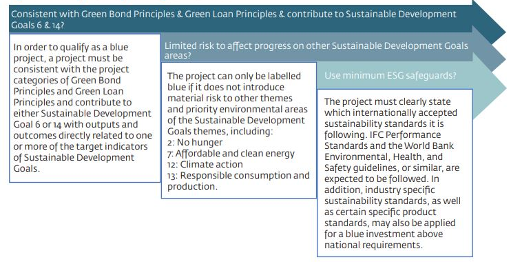 The below schematic from the Guidelines is useful in determining the initial eligibility of a blue finance activity.3