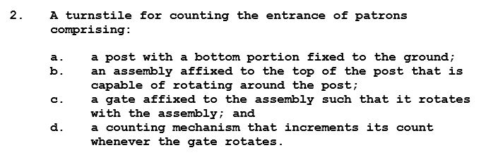 In the real world, one would examine a physical turnstile to see if all limitations of the claim are present to prove infringement. If so, then the manufacturer, seller or user of the turnstile could be infringing the claim.