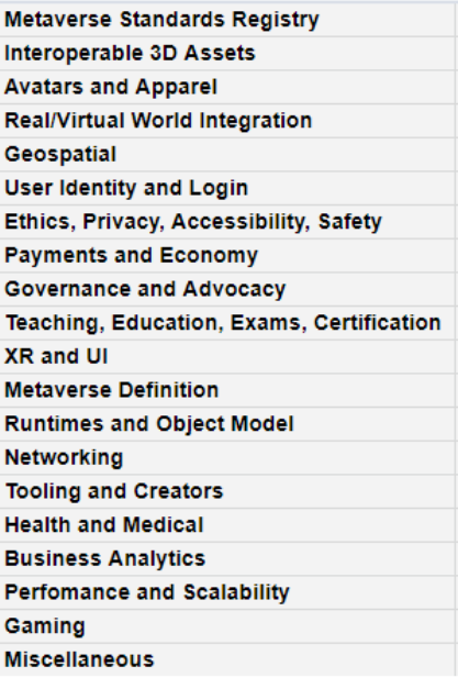 As an analogy, the MSF compares the problem it seeks to solve to the problem of interoperable standards in computers. Computers are a collection of various global standards, including Wi-Fi for wireless networking, Bluetooth for short-range wireless connections, HDMI for video output and USB for peripherals. These various standards need to "talk to" one another using standardized interfaces for the computer to work. A similar same problem arises in the metaverse context. There is a host of SDOs developing hardware standards (e.g., for headset equipment) and software standards (e.g., for virtual assets and virtual worlds). For a system (or systems) to utilize these metaverse standards, they will need to interoperate over standardized interfaces. The MSF plans to foster interoperability through "prototypes, hackathons, plugfests and tooling projects." The early list of topics that MSF may work on includes the following, which spans nearly the entire metaverse domain: