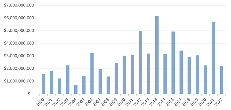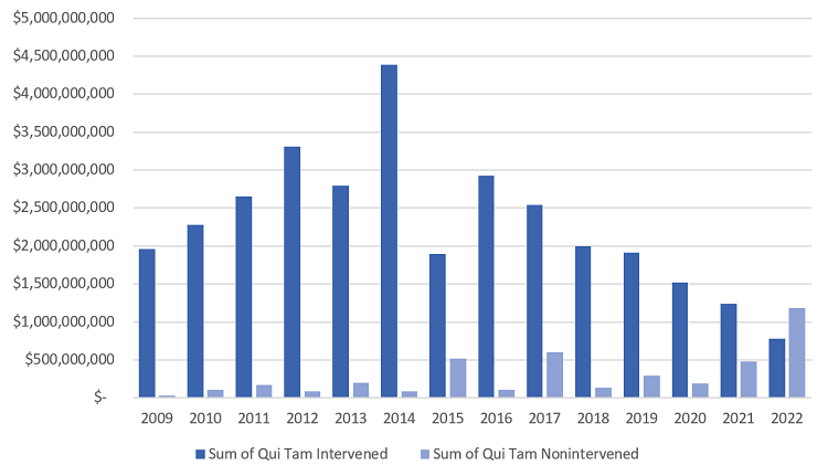 But this year, relators forged ahead and with success – recoveries for relator-led cases more than doubled in 2022 at $1.18 billion, representing roughly half of the total recoveries for the year: